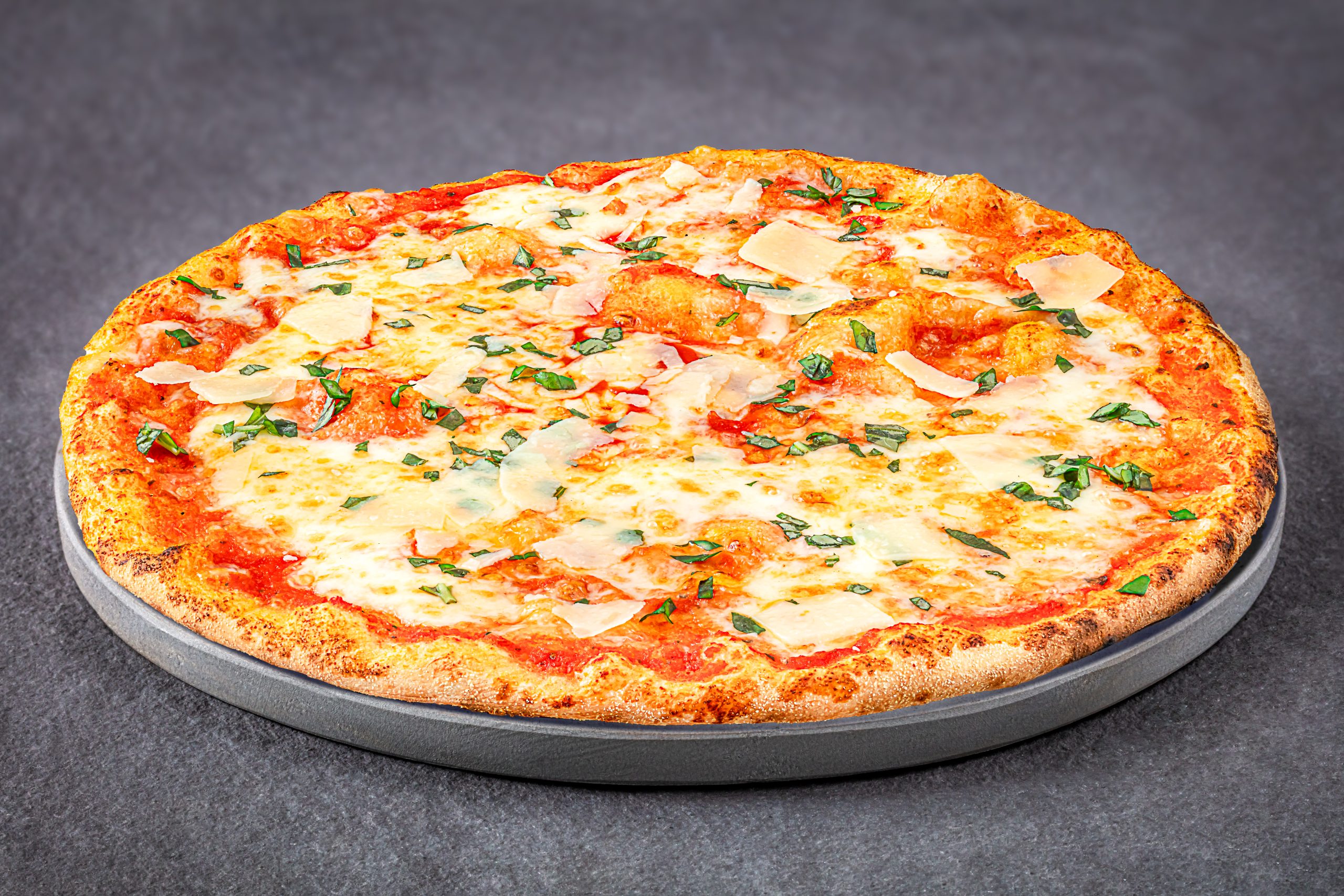 sos de roșii, mozzarella fior di latte, busuioc, parmigiano Reggiano