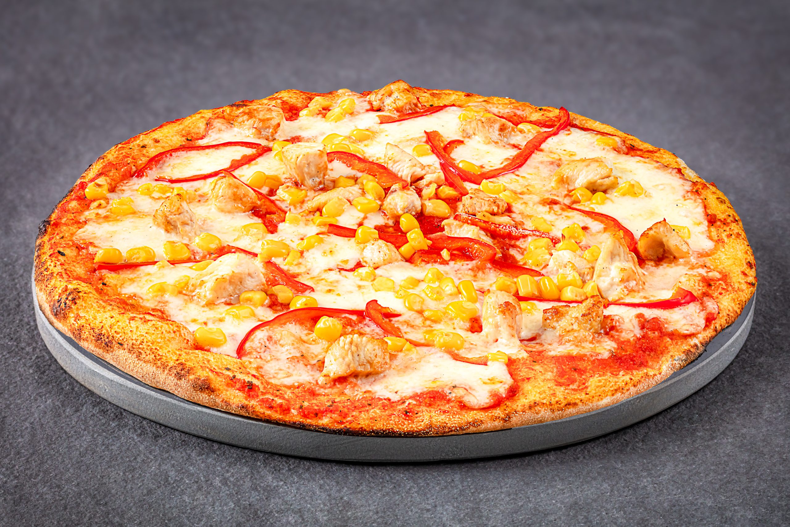 Sos de roșii, mozzarella fior di latte, piept de pui, porumb