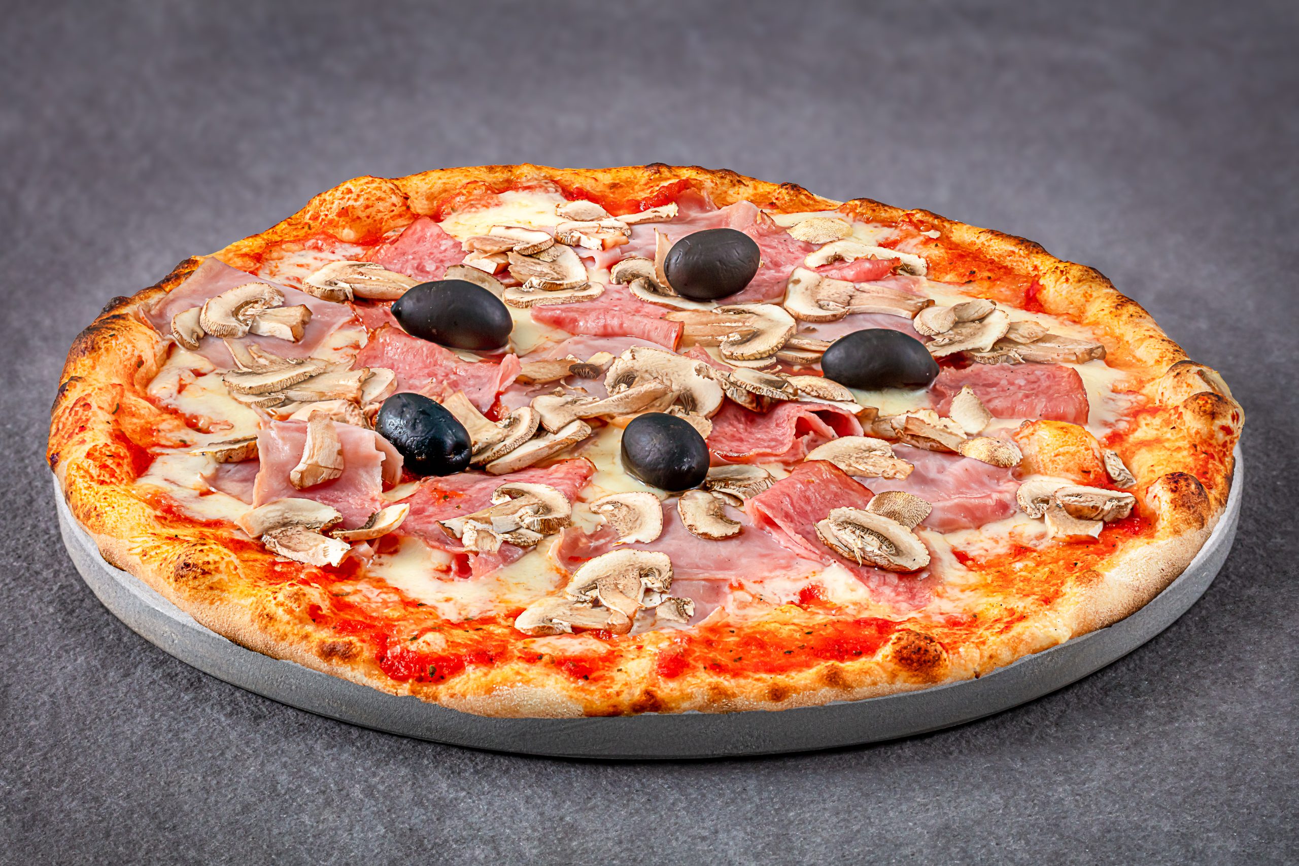 sos de rosii, mozzarella fior di latte, sunca, ciuperci, masline, salam